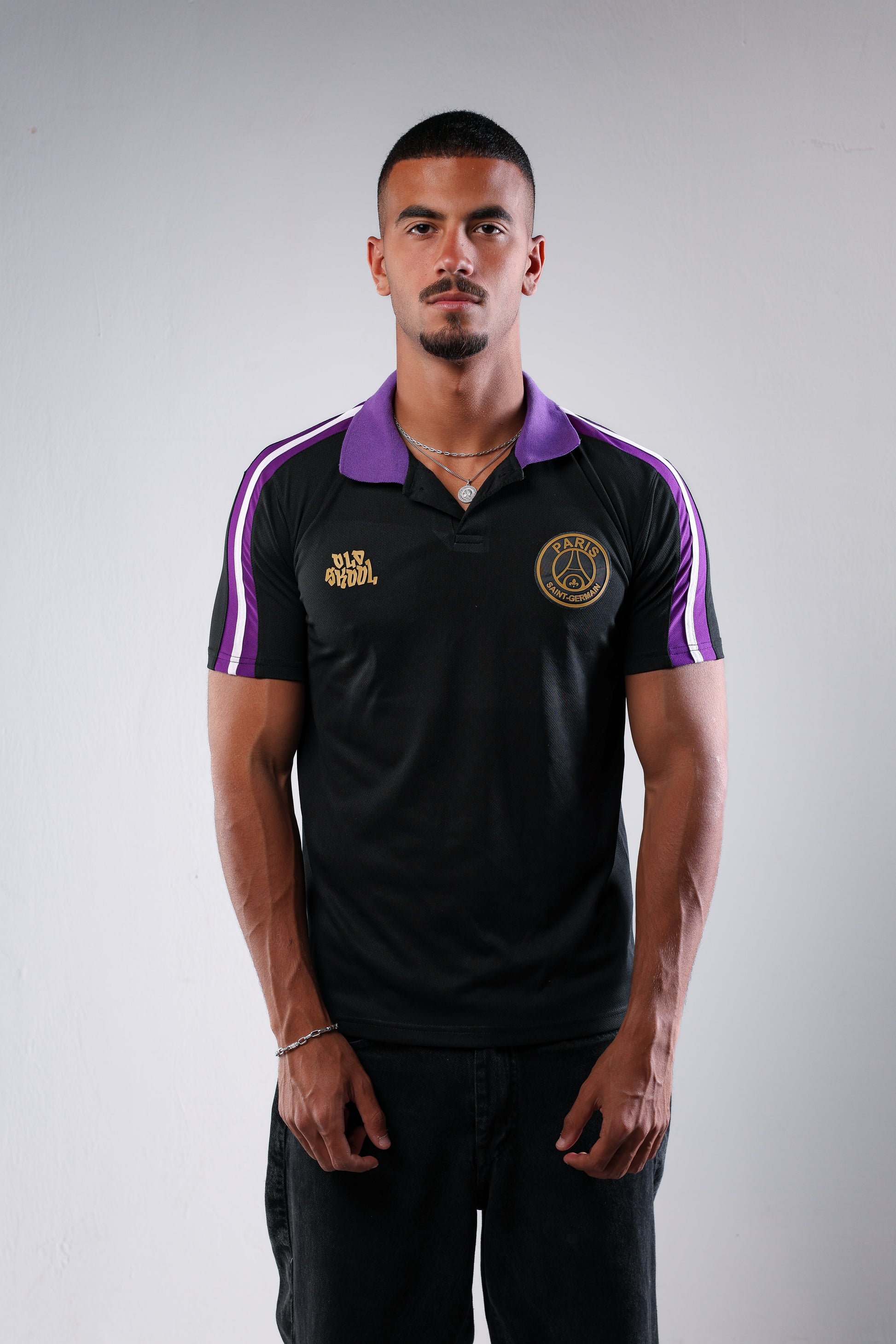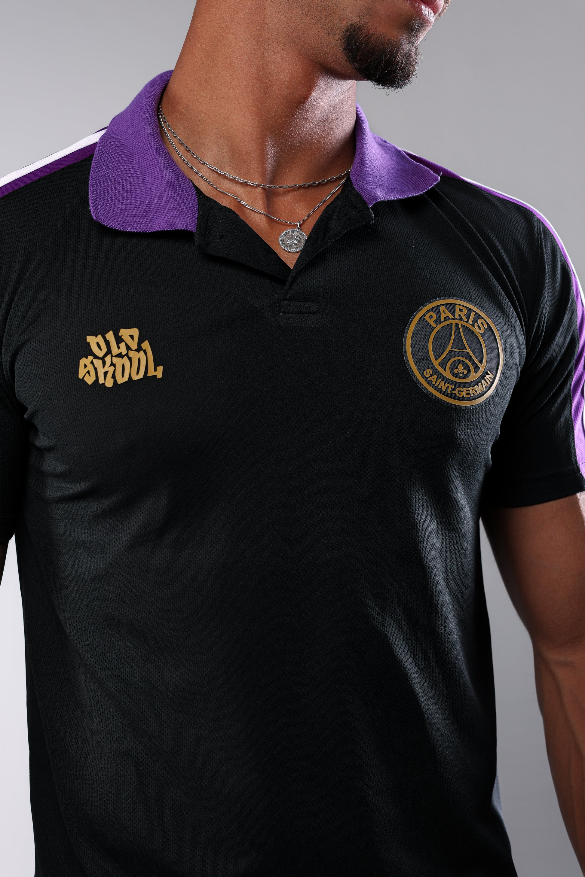 A tribute to the golden era of European football, the Paris Noir '94 shirt fuses retro PSG vibes with deep streetwear sensibility. Featuring royal purple stripes, an old-school collar, and gold detailing that nods to champions of the past — this drop is pure understated power.